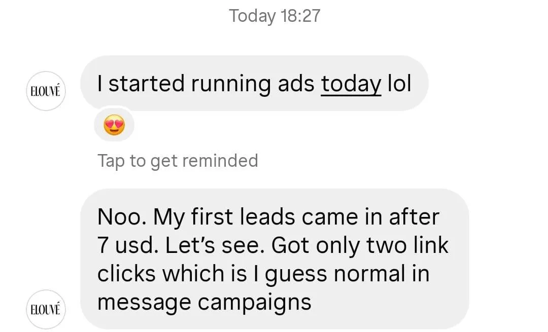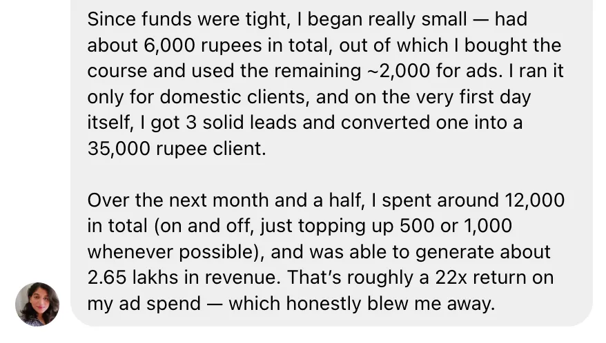 She booked a INR 35,000 (USD 397) client from INR 2000 (USD 22) in ad spend. Then, she booked INR 265,000 (USD 3000) in sales from INR 12,000 (USD 136) in ad spend.