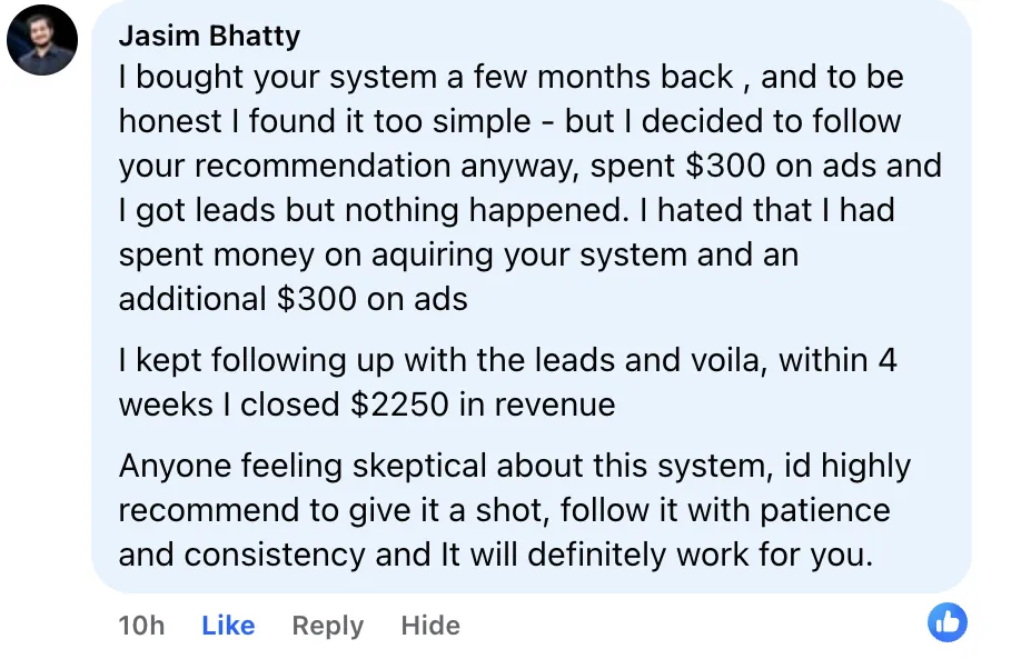 “At first I thought the $10/day system was way too simple to actually work. I spent $300 on ads, got leads, but no sales in the first 20 days — and I was frustrated I’d wasted money.