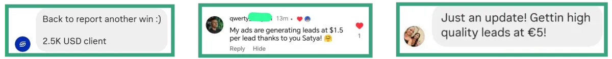 “I've used Satya's ad strategy for the last 1.5 months and closed 3 clients worth $4500 - with just $400 in ad spend.